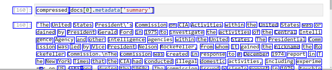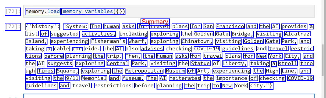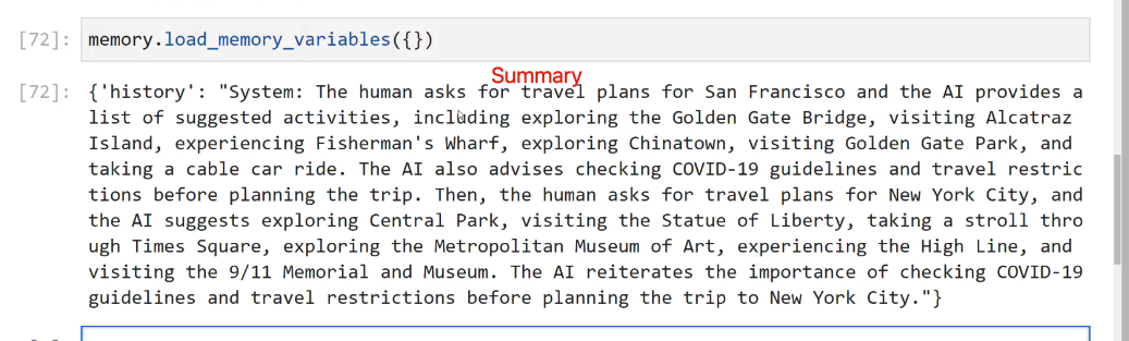 [72]: memory.load memory.variables() Summary [72]: ('history': "System: The human asks for travel plans for San Francisco and the AI provides a list of suggested activities, inclading exploring the Golden Gate Bridge, visiting Alcatraz Island, experiencing Fisherman's Wharf, exploring Chinatown, visiting Golden Gate Park, and taking a cable car ride. The AI also advises checking COVID-19 guidelines and travel restric tions before planning the trip. Then, the human asks for travel plans for New York City, and the AI suggests exploring Central Park, visiting the Statue of Liberty, taking a stroll thro ugh Times Square, exploring the Metropolitan Museum of Art, experiencing the High Line, and visiting the 9/11 Memorial and Museum. The AI reiterates the importance of checking COVID-19 guidelines and travel restrictions before planning the trip to New York City.")