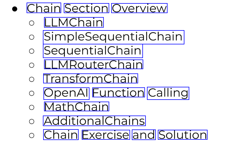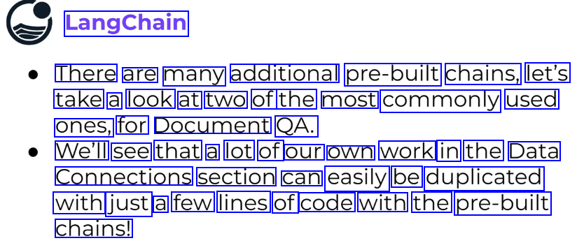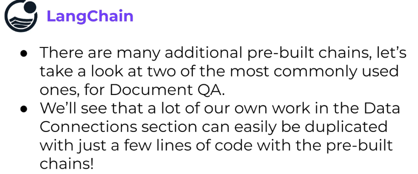 LangChain There are many additional pre-built chains, let's take a look at two of the most commonly used ones, for Document QA. We'll see that a lot of our own work in the Data Connections section can easily be duplicated with just a few lines of code with the pre-built chains!
