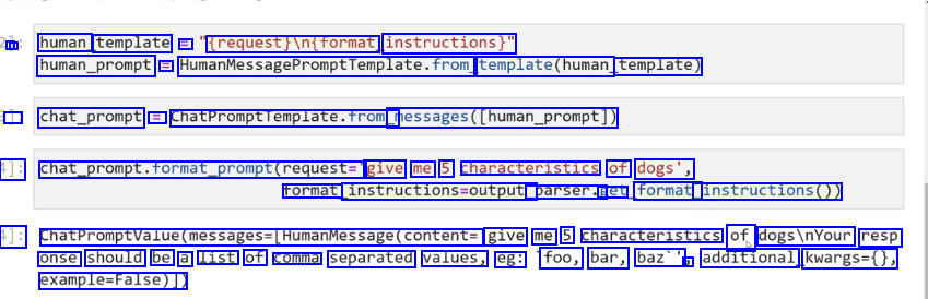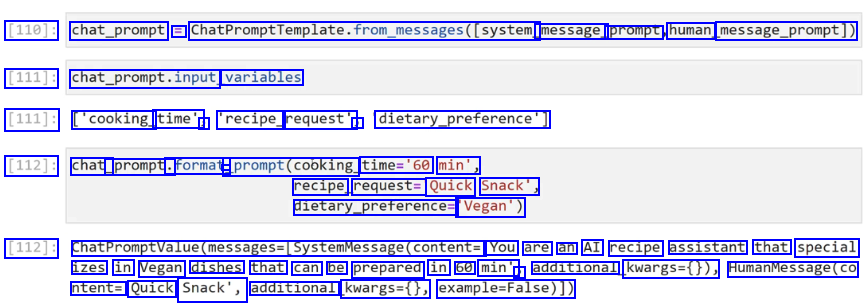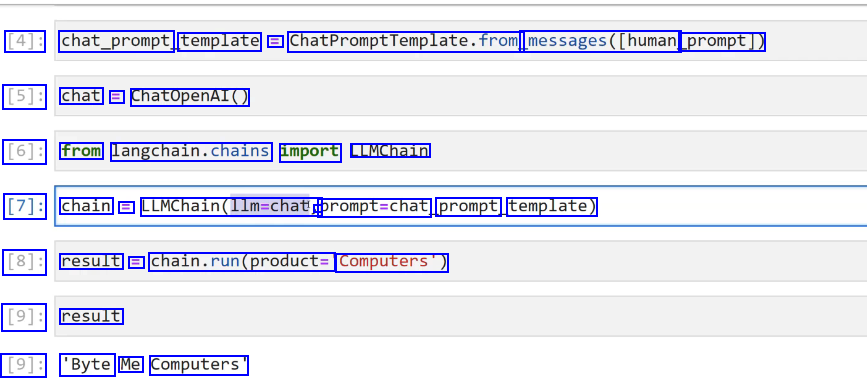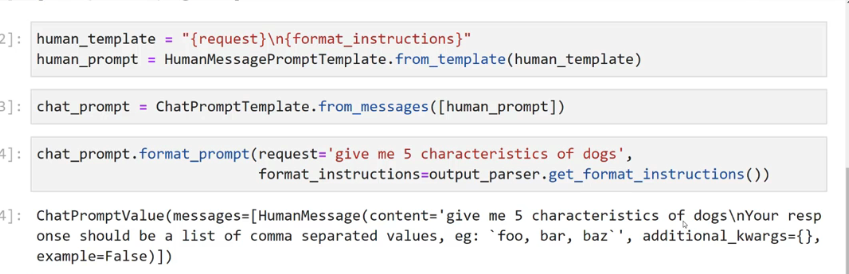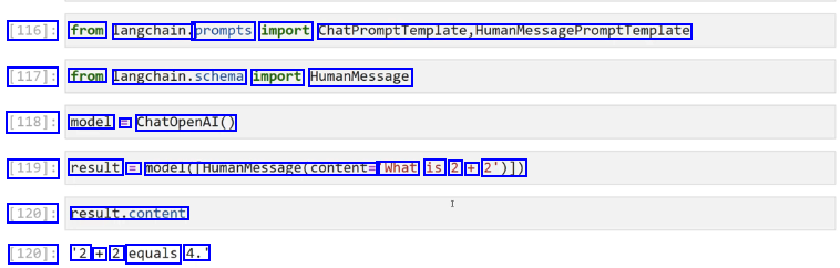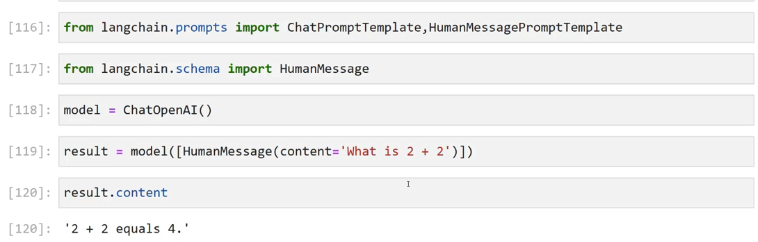 [116]: from langchain. prompts import ChatPromptTemplate,HumanMessagePromptTemplate [117]: from Langchaln.schema import HumanMessage [118]: model = ChatOpenAI() [119]: result = model(HumanMessage(content= What is 2 + 2')1) [120]: result.content [120]: '2 + 2 equals 4.'