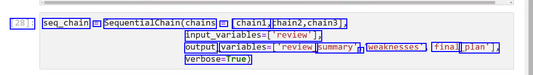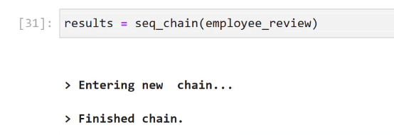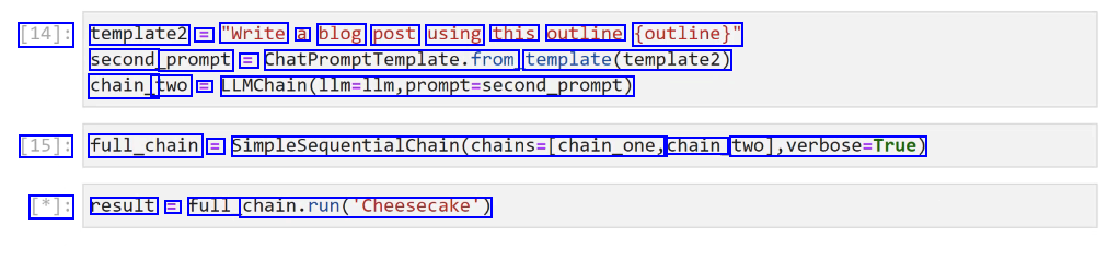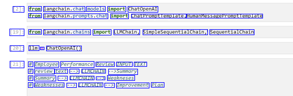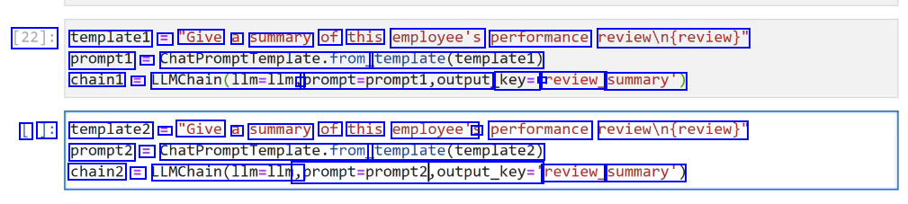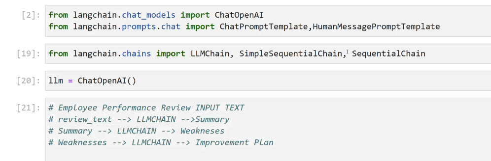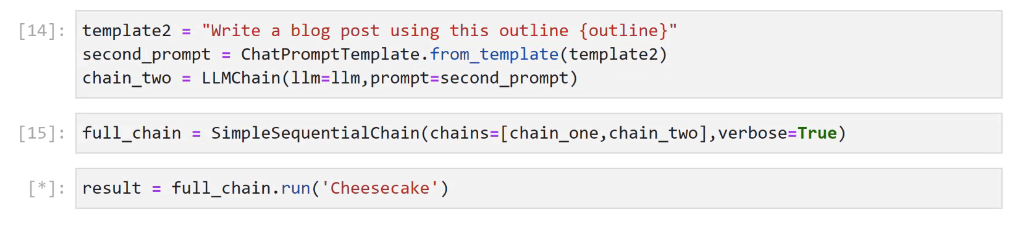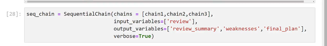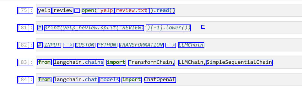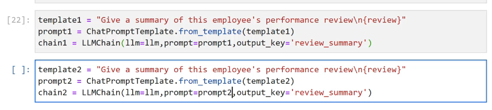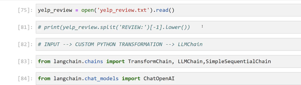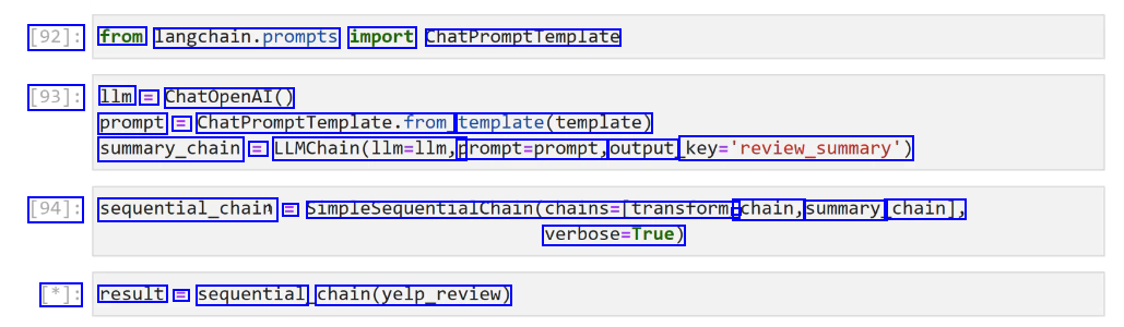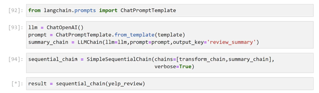 [92]: from langchain.prompts import ChatPromptTemplate [93]: 1lm = ChatOpenAI() prompt = ChatPromptTemplate.from template(template) summary_chain = LLMChain(llm-llm, prompt=prompt, output key-'review.summary) [94]: sequential_chain E SimplesequentialChain(chains=Itransform - chain, summary. chain], verbose-True) [*]: result E sequential chain(yelp_review)