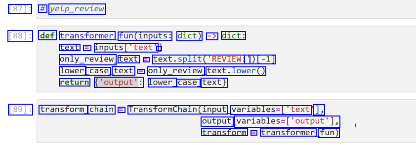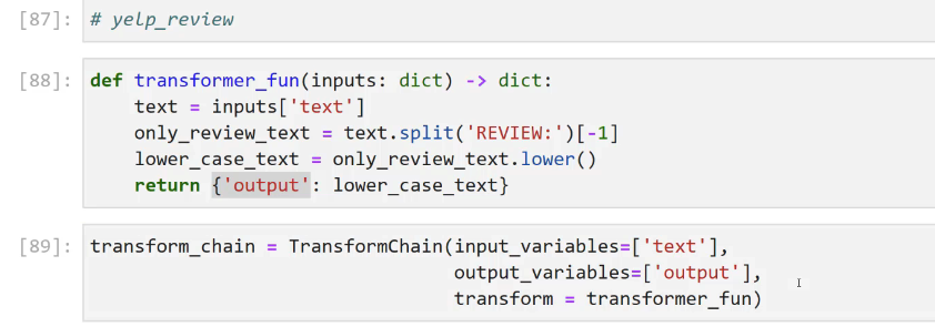 [87]: # yelp_review [88]: def transformer fun(inputs: dict) -> dict: text = inputs_'text' - only_review text L text.split(REVIEN: ')[-1] lower case text l only_review text.lower() return ('output': lower_ case_ text) [89]: transform chain E Transformchain(input variables-[text ], output, variables-(output'), transform E transformer fun)