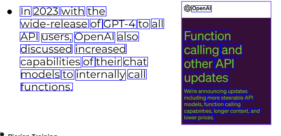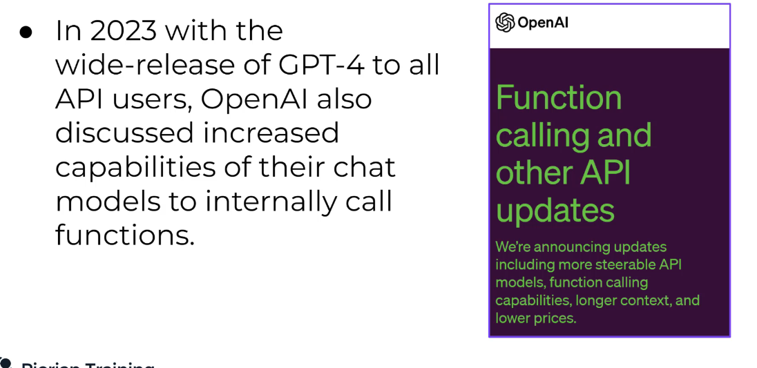 In 2023 with the OpenAl wide-release of GPT-4 to all API users, OpenAl also Function discussed increased calling and capabilities of their chat other API models to internally call updates functions. We're announcing updates including more steerable API models, function calling capabilities, longer context, and lower prices.