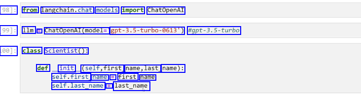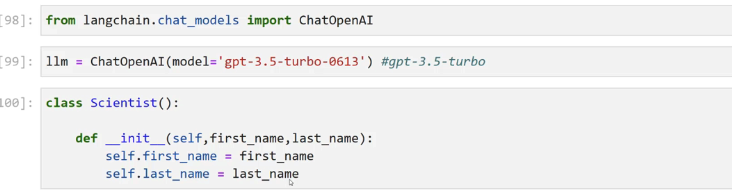 98]: from langchain.chat, models import ChatOpenAI 99]: 1lm = ChatOpenAI(model- ept-3.5-turbo-6613) #gpt-3.5-turbo 100]: class Scientist(): def init (self,first name,last name): self.first name E first name self.last_name E last_name