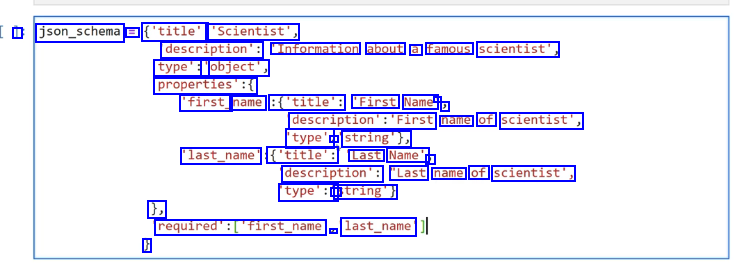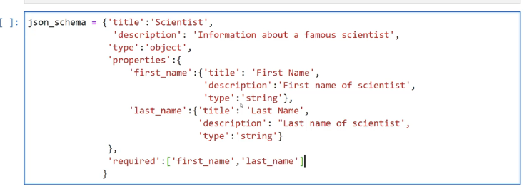 I json_schema = ('title': 'Scientist', description': "Information about a famous scientist', type':' 'object', properties':( 'first_ name' :('title': 'First Name - ) description's'First name of scientist', type': - string'), last_name' ('title': Last Name', J description': "Last name of scientist', type':' string') 1, required'sCfirst.name 2- last_name' J