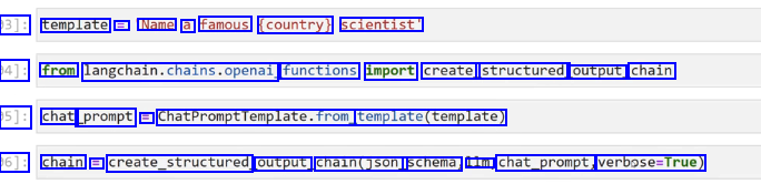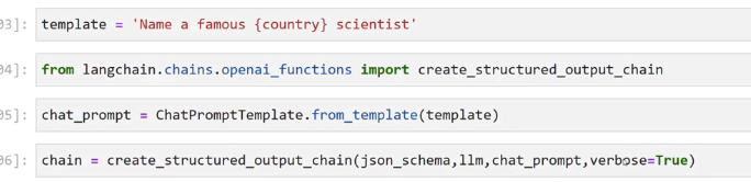 3]: template == Name a famous (country) scientist' 94]: from langchain.chains.openai functions import create_ structured output_ chain 05]: chat prompt E ChatPromptTemplate.from template(template) 06]: chain == create_structured output chain(json_ schema, lm. chat_prompt, verbose-True)