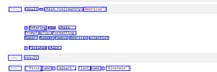 [107]: result == chaln.run(country American') > Entering new chain... Prompt after formatting: Human: Name a famous American scientist > Finished chain. [108]: result [108]: ('first_ name : 'Albert', last_ name : 'Einstein')