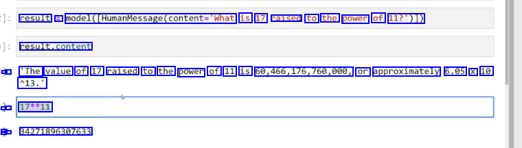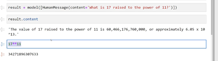 result == model(CHumanMessage(content='What is 17 raised to the power of 11?')1) result.content - : 'The value of 17 raised to the power of 11 is 60,466,176,760,000, or approximately 6.05 X 10 113.' - - 17**11 - - : 34271896307633