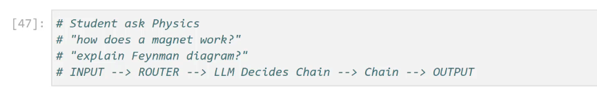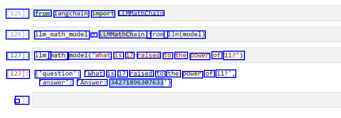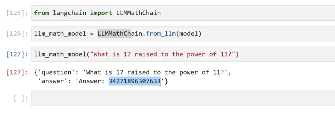 [125]: from langchain import LLMMathChain [126]: llm_math_model = LLMMathChain.f from_ 11m(model) [127]: 1lm_ math model("What is 17 raised to the power of 11?") [127]: ('question': "What is 17 raised to the power of 11?', answer': Answer: 34271896307633) - J: