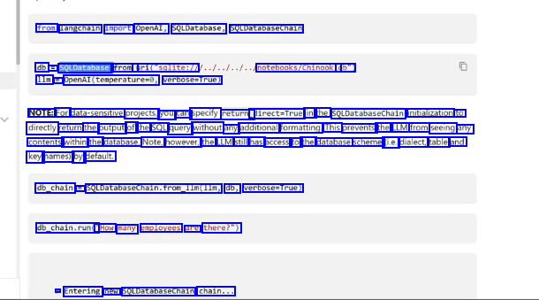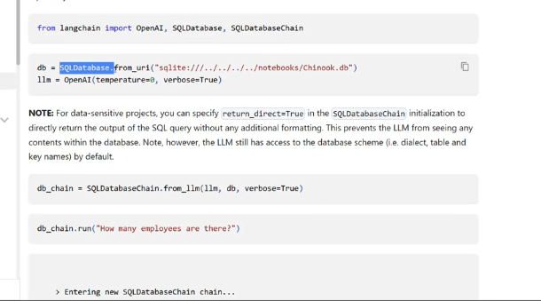 from langchain import OpenAl, SQLDatabase, SQLDatabaseChain db = SQLDatabase. from_ uri("sqlite:/1 1lm = Openal(temperatured, verbose-True) notebooks/Chinook. db") NOTE: For data-sensitive projects, you can specify return_ direct=True in the SQLDatabasechain initialization to directly return the output of the SQL query without any additional formatting. This prevents the LLM from seeing any contents within the database. Note, however, the LLM still has access to the database scheme (ie. dialect, table and key names) by default. db_chain = SQLDatabaseChain.from_lm(lIm, db, verbose-True) db_chain.run(" "How many employees are there?") > Entering new SOLDatabasechain chain...
