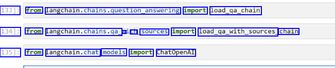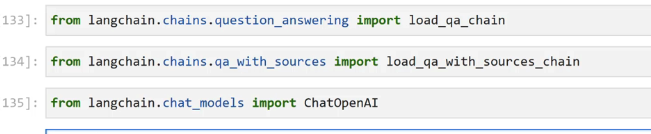 133]: from langchain.chains.question_answering import load_ga_chain 134]: from langchan.chains.ge. N an sources import load_ga.with.sources, chain 135]: from langchain.chat models import ChatOpenAI