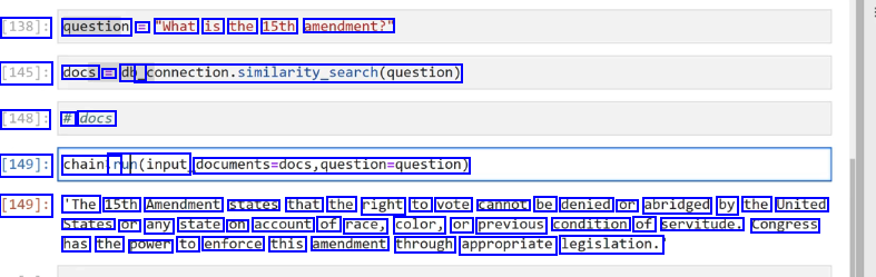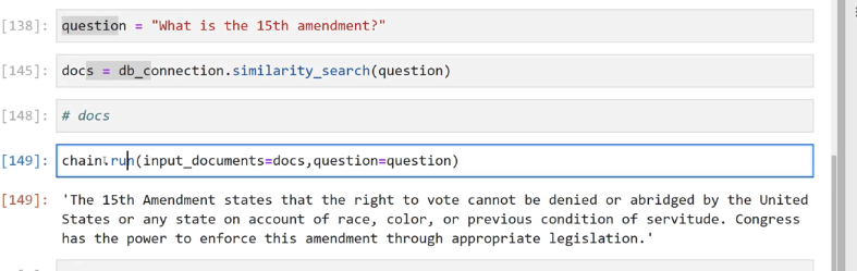[138]: question == "What is the 15th amendment?" [145]: docs E db_ _connection.similarity_search(question) [148]: # docs [149]: chainir ruh(input documents-docs,question-question) [149]: 'The 15th Amendment states that the right to vote cannot be denied or abridged by the United States or any state on account of race, color, or previous condition of servitude. congress has the power to enforce this amendment through appropriate legislation.