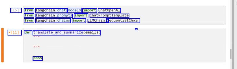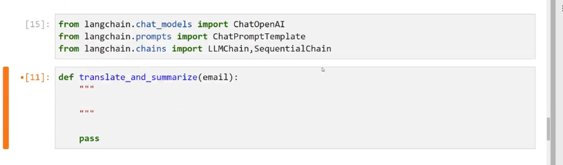 [15]: from langchain.chat models import ChatOpenAI from langcnaln.prompts import chatPromptremplate from langchain.chains import LLMChain, SequentialChain - *[11]: def translate.and_summarize(email): pass