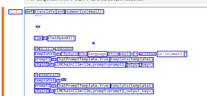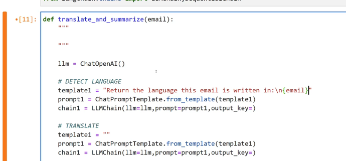[11]: def translate and summarize(email): E 1lm E ChatOpenAI() # DETECT LANGUAGE template1 E "Return the language this email is written in:in(email)f prompt1 E ChatPromptfemplate.fromg template(templatel) chain1 == LUMChain(llm-llm,prompt-promptl, output_ key=) # TRANSLATE templatel = - - prompt1 = ChatPromptTemplate.from template(templatel) chain1 = LLMChain(llm-llm,prompt-prompti,output_key-)