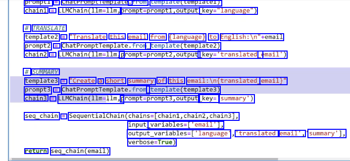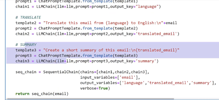 prompti == cnatrromptiemplate. Trom template(templatel) chain1 = LLMChain(llm-llm, prompt-prompt1,output key-"language") # TRANSLATE template2 = "Translate this email from (language) to English:ln"semail prompt2 = ChatPromptfemplate.fror, template(template2) chain2 E LLMChain(llm-llm, promptsprompt2,output. key-'translated email') # SUMMARY template3 = "Create a short summary of this email:in(translated, email)" prompt3 = ChatPromptremplate.from template(templates) chain3 == LLMChain(llm-llm,p prompt-prompt3,output key= summary') seq_chain = SequentialChain(chains-(chain1,chain2,chain3], input variables-lemall], output_variables-('language 'translated email', summary'1, verbose-True) return seq_chain(email)