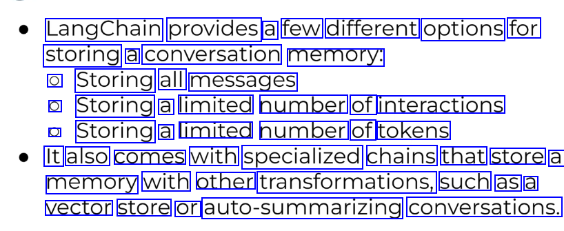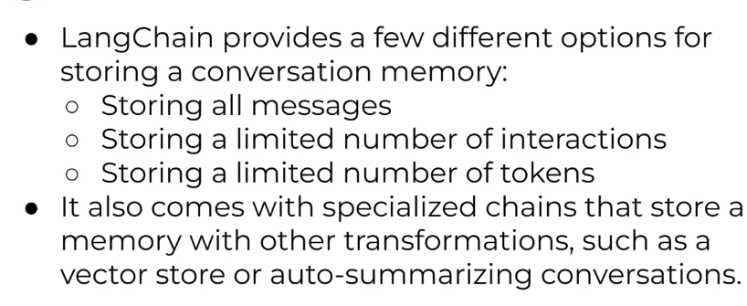 LangChain provides a few different options for storing a conversation memory: O Storing all messages O Storing a limited number of interactions O Storing a limited number of tokens It also comes with specialized chains that store a memory with other transformations, such as a vector store or auto-summarizing conversations.