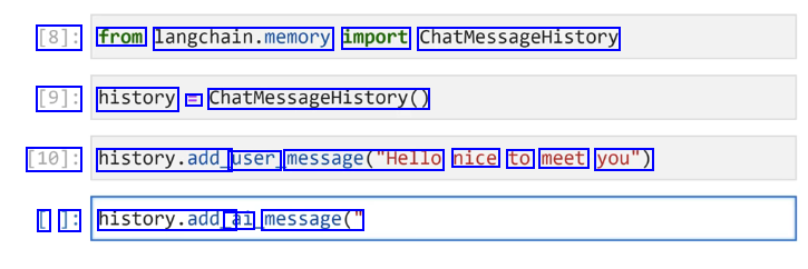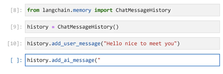[8]: from langchain.memory import ChatMessageHistory [9]: history E ChatmessageHistory@ [10]: history.add_ user message("Hello nice to meet you") I ]: history.add_ ai message("
