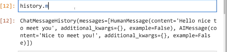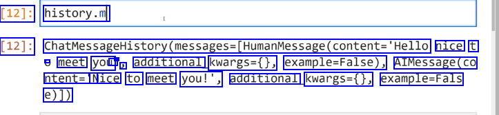 [12]: history.m [12]: ChatMessageHistory(messages-(HumanMessage(content-'Hello nice t - meet you I - J additional kwargs=0, example-False), AIMessage(co ntent='N Nice to meet you!', additional kwargs=0, example-Fals e)])