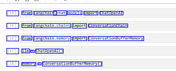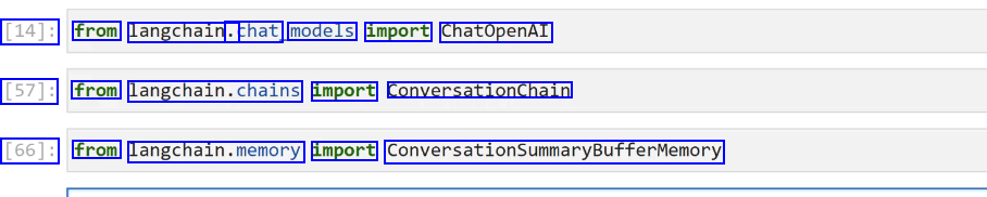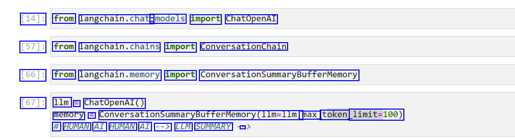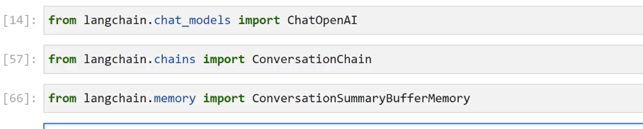 [14]: from langchain. .chat models import ChatOpenAI [57]: from langchain.chains import ConversationChain [66]: from langchain.memory import ConversationSummaryBufferMemory