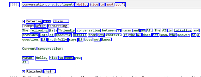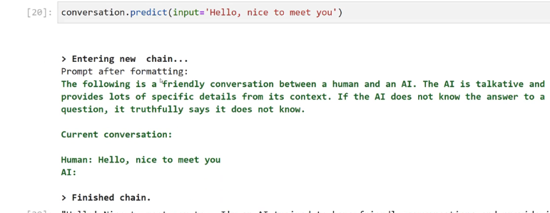 [20]: conversation.predict(input= 'Hello, nice to meet you') > Entering new chain... Prompt after formatting: The following is a "friendly conversation between a human and an AI. The AI is talkative and provides lots of specific details from its context. If the AI does not know the answer to a question, it truthfully says it does not know. Current conversation: Human: Hello, nice to meet you AI: > Finished chain.