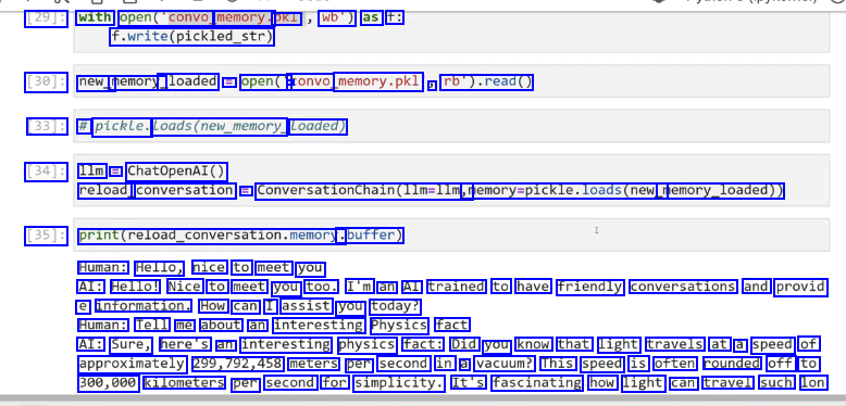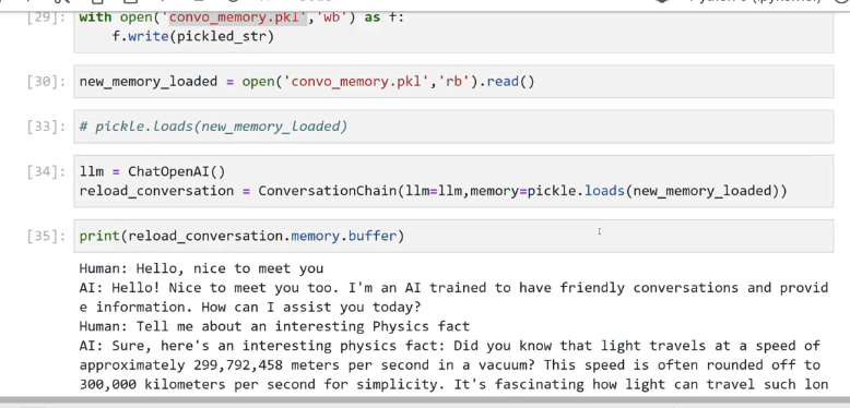 29J: with open(convo memory. pkl wb") as f: f.write(pickled_.str) [30]: new_ memory_ _loaded = open(" a convo memory.pkl ) rb').read() [33]: # pickle. Loads(new_memory Loaded) [34]: 1lm =E ChatOpenAI() reload_ conversation E ConversationChain(1lm=llm, memory-pickle.loads(new_ memory_loaded)) [35]: print(reload_conversation.memory. .buffer) Human: Hello, nice to meet you AI: Hello! Nice to meet you too. I'm an AI trained to have friendly conversations and provid e information. How can I assist you today? Human: Tell me about an interesting Physics fact AI: Sure, here's an interesting physics fact: Did you know that light travels at a speed of approximately 299,792,458 meters per second in a vacuum? This speed is often rounded off to 300,000 kilometers per second for simplicity. It's fascinating how light can travel such lon