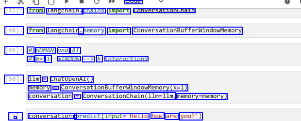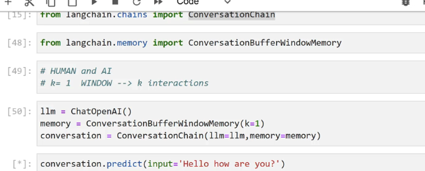 soue [15J: from langchain. chains import conversationchain [48]: from langchain. .memory import ConversationBufferwindowMemory [49]: # HUMAN and AI # k= 1 WINDOW --> k interactions [50]: 1lm ChatOpenAI() memory E Conversationbufferwindowkemory(k-1) conversation == ConversationChain(llm-llm memory-memory) [*]: - conversation. - predict(input."Hello how are you?')