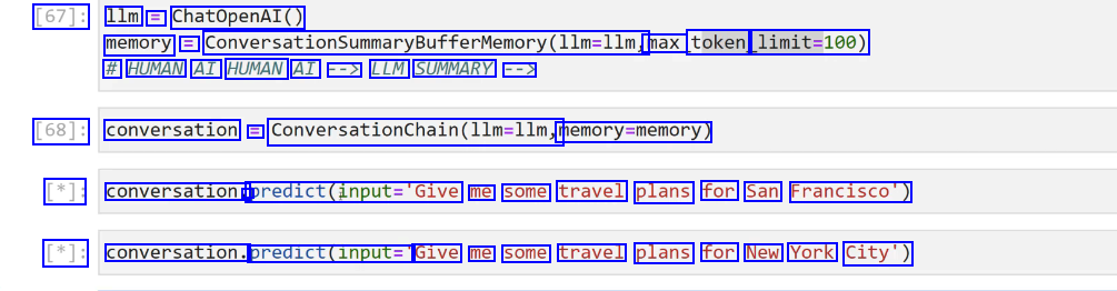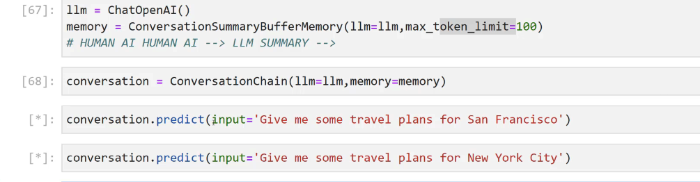 [67]: 1lm = ChatOpenAI() memory = ConversationSummaryBufferMemorMemory(llm-llm, max token limit=100) # HUMAN AI HUMAN AI --> LLM SUMMARY --> [68]: conversation = Converationchalindle-lim, memory-memory) [*]: conversation. - predict(input-'Give me some travel plans for San Francisco') [*]: conversation. predict(input=" Give me some travel plans for New York City')