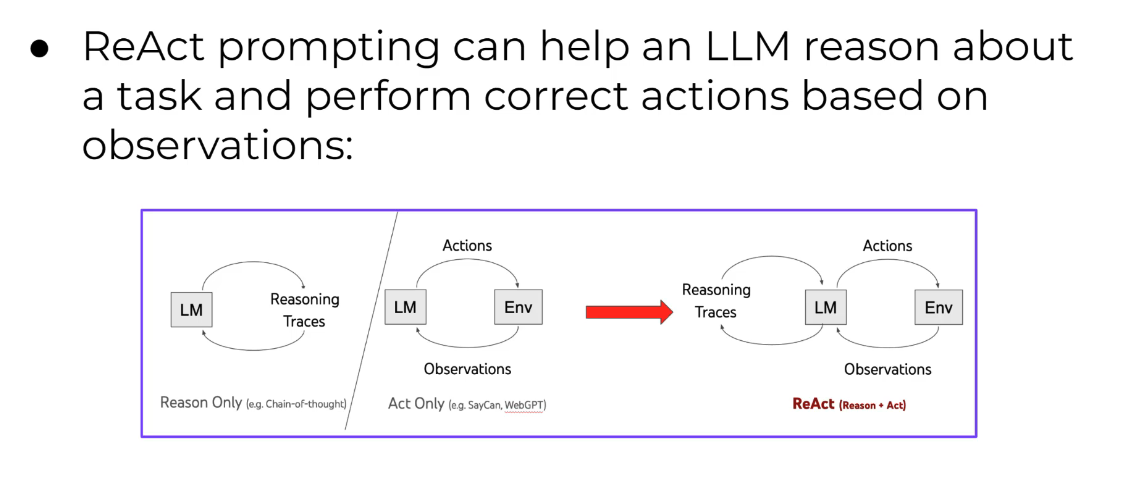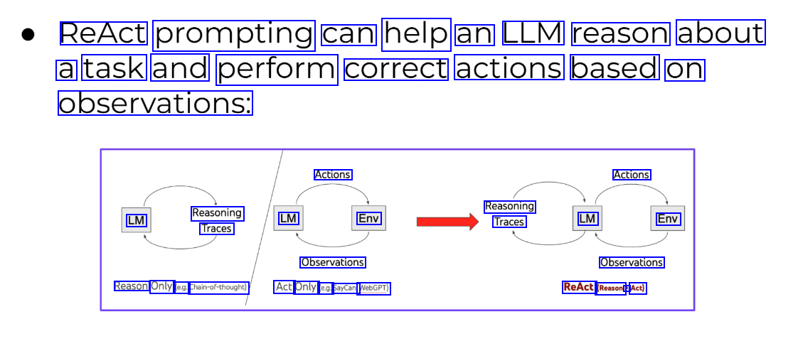 ReAct prompting can help an LLM reason about a task and perform correct actions based on observations: Actions Actions Reasoning Traces LM Reasoning Traces LM Env LM Env Observations Observations Reason Only (e.g. Chain-of-thought) Act Only (e.g. SayCan, WebGPT) ReAct (Reason + Act)