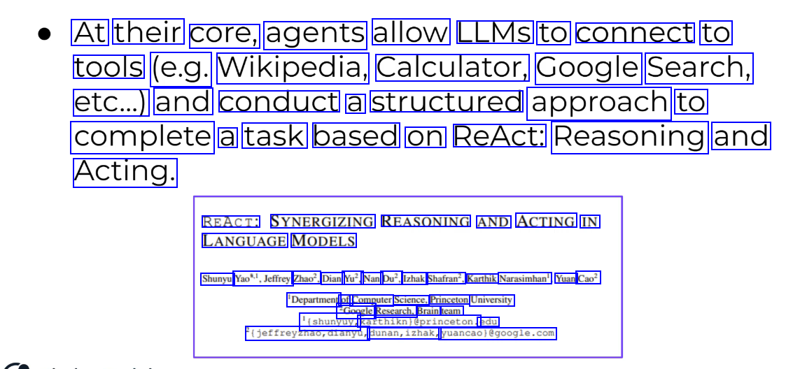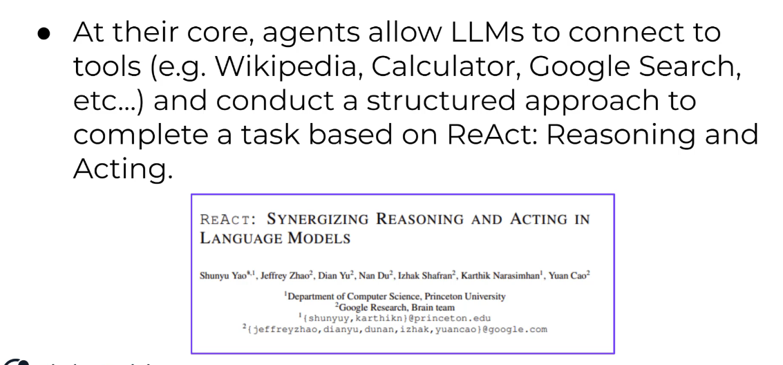 At their core, agents allow LLMS to connect to tools (e.g. Wikipedia, Calculator, Google Search, etc...) and conduct a structured approach to complete a task based on ReAct: Reasoning and Acting. REACT: SYNERGIZING REASONING AND ACTING IN LANGUAGE MODELS Shunyu Yao",Jeffrey Zhao?, Dian Yu?, Nan Du?, Izhak Shafran?, Karthik Narasimhan', Yuan Cao? 'Department of Computer Science, Princeton University 2Google Research, Brain team '(shunyuy, Karthiknieprinceton. edu igeffreyzhao,dianyu, dunan,izhak, yuancaolegoogle.com