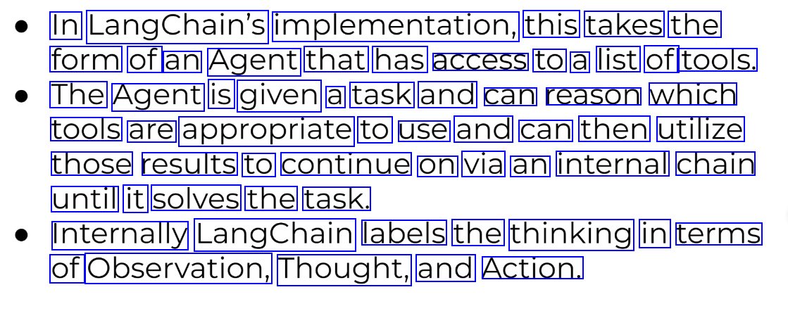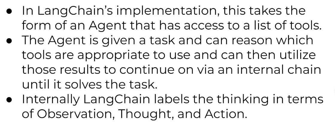 In LangChain's implementation, this takes the form of an Agent that has access to a list of tools. The Agent is given a task and can reason which tools are appropriate to use and can then utilize those results to continue on via an internal chain until it solves the task. Internally LangChain labels the thinking in terms of Observation, Thought, and Action.