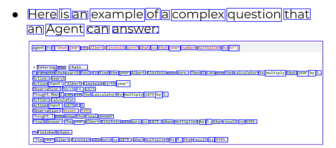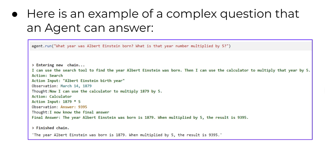 Here is an example of a complex question that an Agent can answer. agent run( ("What year was Albert Einstein born? What is that year number multiplied by 5?") Entering new chain... I can use the search tool to find the year Albert Einstein was born. Then I can use the calculator to multiply that year by 5. Action: Search Action Input: "Albert Einstein birth year" Observation: March 14, 1879 Thought:Now I can use the calculator to multiply 1879 by 5. Action: Calculator Action Input: 1879 * 5 Observation: Answer: 9395 Thought:I now know the final answer Final Answer: The year Albert Einstein was born is 1879. When multiplied by 5, the result is 9395. > Finished chain. The year Albert Einstein was born is 1879. When multiplied by 5, the result is 9395.