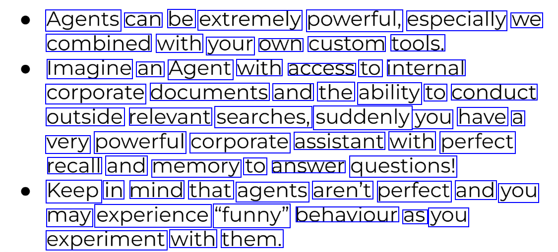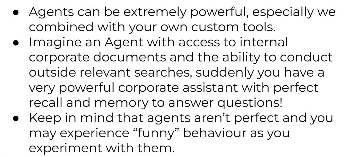 Agents can be extremely powerful, especially we combined with your own custom tools. Imagine an Agent with access to internal corporate documents and the ability to conduct outside relevant searches, suddenly you have a very powerful corporate assistant with perfect recall and memory to answer questions! Keep in mind that agents aren't perfect and you may experience "funny" behaviour as you experiment with them.
