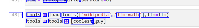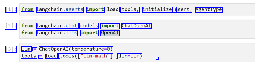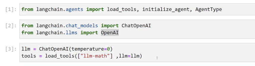 [1]: from langchain.agents import load tools, initialize_ agent, AgentType [2]: from langchain.chat, models import ChatOpenAI from langchain.llms import OpenAI [3]: 1lm = ChatOpenAl(temperature-0) tools E Load tools(Cllm-math") 1lm=1lm) I