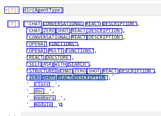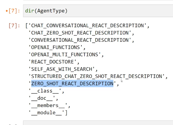[7]: dir(AgentType) [7]: ['CHAT CONVERSATIONAL REACT DESCRIPTION" 'CHAT ZERO SHOT REACT DESCRIPTION" CONVERSATIONAL REACT DESCRIPTION" 'OPENAI FUNCTIONS OPENAI MULTI FUNCTIONS REACT DOCSTORE 'SELF ASK WITH SEARCH' STRUCTURED CHAT ZERO SHOT REACT DESCRIPTION" 'ZERO SHOT REACT DESCRIPTION" class doc members module -