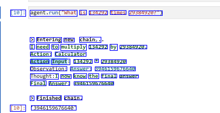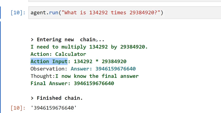 [10]: agent.run("What is 134292 times 29384920?") > Entering new chain,. I need to multiply 134292 by 29384920. Action: Calculator Action Input: 134292 * 29384920 Observation: Answer: 3946159676640 Thought:I now know the final answer Final Answer: 39461596/6640 > Finished chain. [10]: 3946159676640