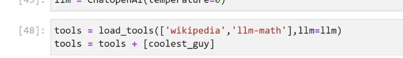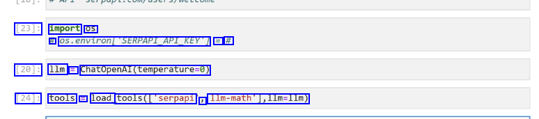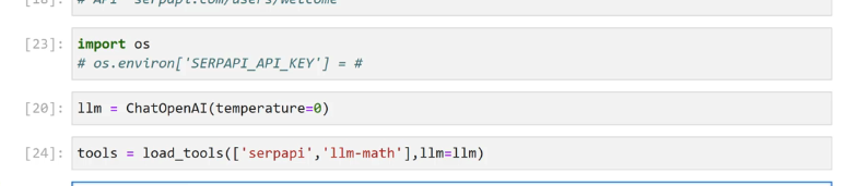 [23]: import OS # 05.environ/SERPAPLAPIKEYT == # [20]: 1lm = ChatopenAl(temperature-0) [24]: tools E load tools(l'serpapi J Ilm-math'],lim-lIm)