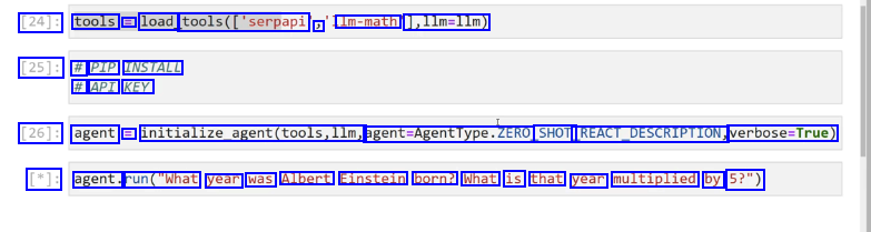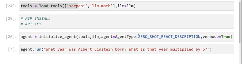 [24]: tools = load_ tools(['serpapi ) Im-math 1,11m=llm) [25]: # PIP INSTALL # API KEY [26]: agent = initialize_agent(tools,llm, agent-Agentlype.ZERO SHOT REACT.DESCRIPTION, verbose-True) [*]: agent. run("What year was Albert Einstein born? What is that year multiplied by 5?")