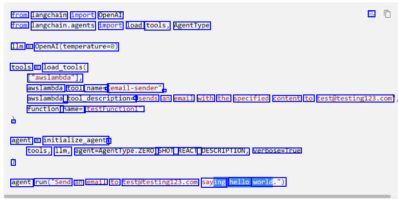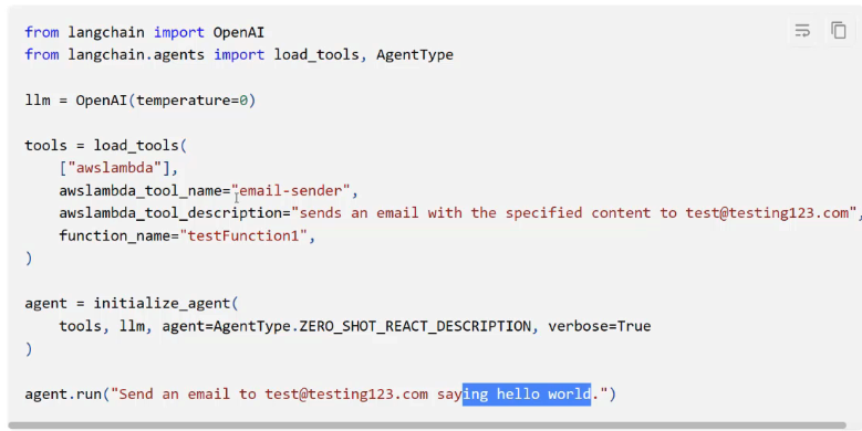 from langchain import OpenAI -> from langchain.agents import load tools, AgentType 1lm = OpenAI(temperature-0) tools == load_tools( ["awslambda"], awslambda tool name= - email-sender" - awslambda_ tool_description= - sends an email with the specified content to test@testing123.com function_ name=' testFunction1" - agent = initialize_agent ( tools, 1lm, egent-Agentlype.ZERO SHOT_ _REACT_ DESCRIPTION, verbose=True ) agent run("Send an email to test@testing12.com saying hello world.")
