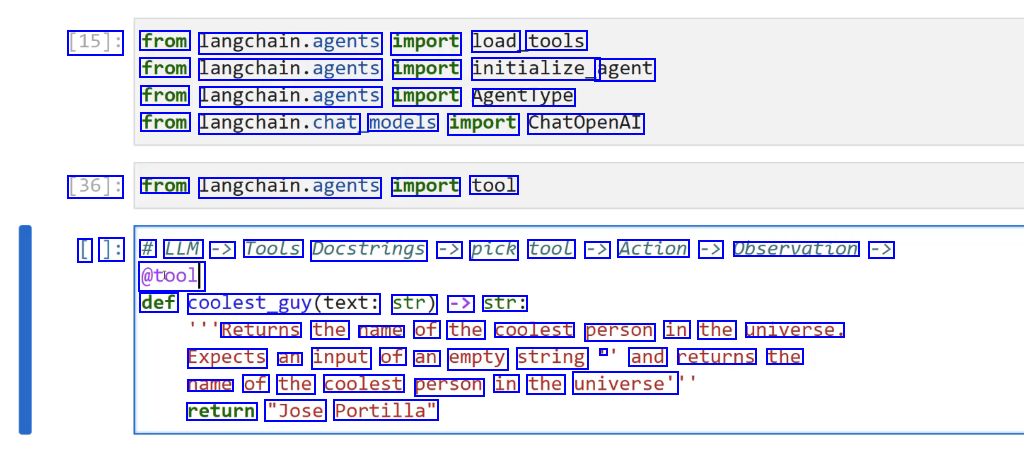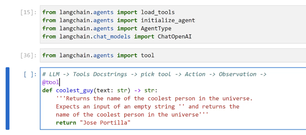 [15]: from langchain.agents import load tools from langchain.agents import initialize_ agent from langchain.agents import Agenttype from langchain.chat, models import ChatOpenAI [36]: from langchain.agents import tool [ ]: # LLM -> Tools Docstrings -> pick tool -> Action -> Observation -> @tool def coolest_guy(text: str) -> str: Returns the name of the coolest person in the universe. Expects an input of an empty string - and returns the name of the coolest person in the universe' return "Jose Portilla"