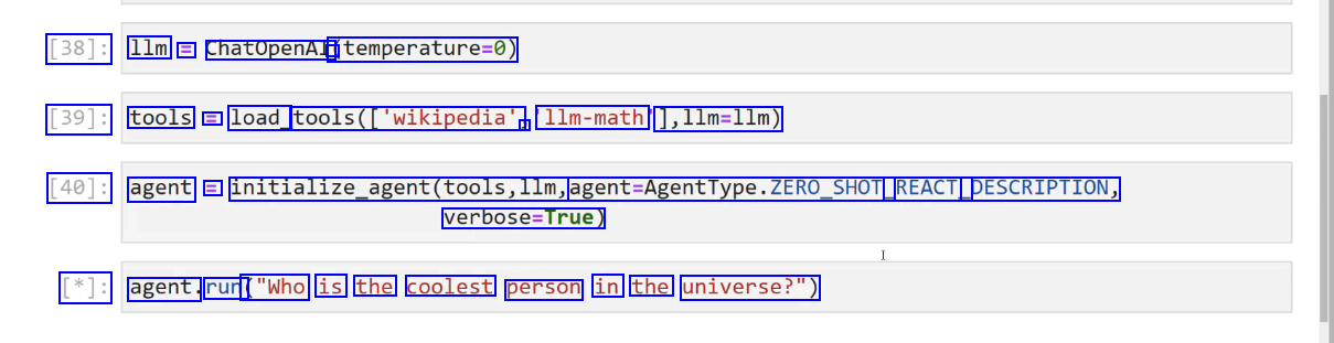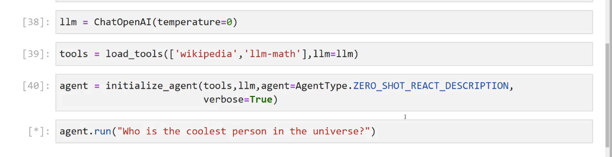 [38]: 1lm E ChatOpenAI Ã (temperature-0) [39]: tools E load_ tools(lwikipedia", ) 1lm-math 1,11m=11m) [40]: agent = initialize_agent(tools,llm, agent-AgentType.ZERO_SHOT REACT_ DESCRIPTION, verbose-True) [*]: agent. run ("Who is the coolest person in the universe?")