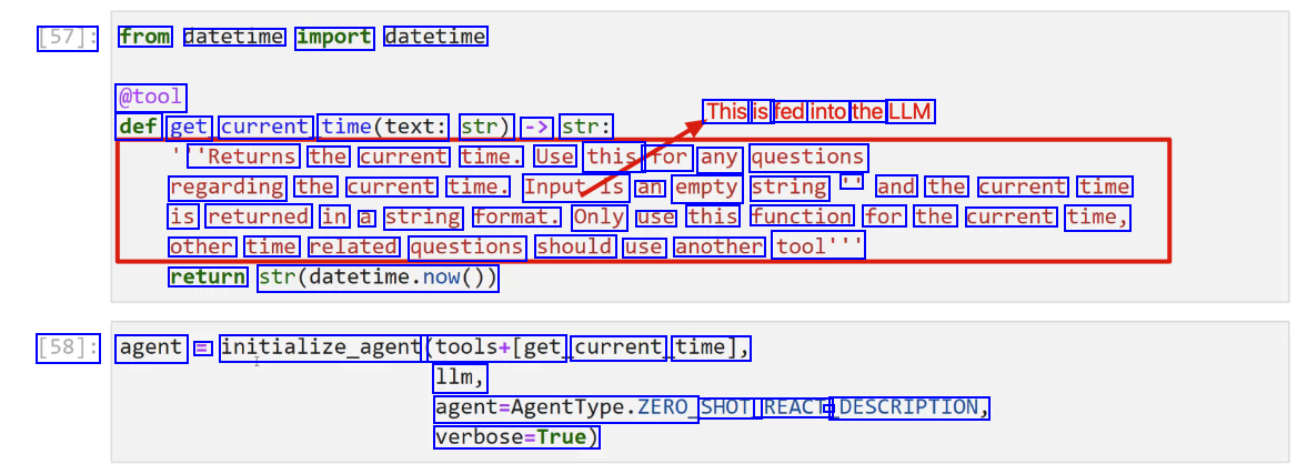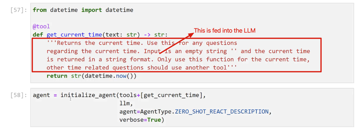 [57]: from datetime import datetime @tool This is fed into the LLM def get current time(text: str) -> str: 'Returns the current time. Use this for any questions regarding the current time. Inputis an empty string II and the current time is returned in a string format. Only use this function for the current time, other time related questions should use another tool'" return str(datetime.now()) [58]: agent = initialize_agent (tools+Iget current time], 11m, agent-Agenttype.ZERO, SHOT_ REACT - DESCRIPTION, verbose-True)