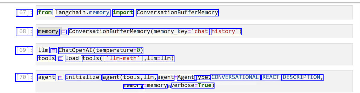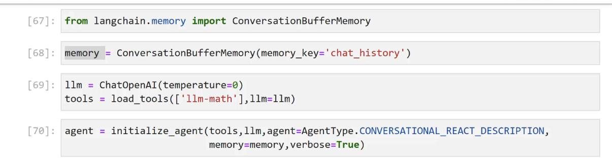 [67]: from langchain.memory import ConversationBufferMemory [68]: memory = ConversationBufferMemory(memory_key-'chat history') [69]: 1lm = ChatOpenAI(temperature-0) tools = load_ tools(C'llm-math'],llm-l1m) [70]: agent E initialize agent(tools,llm, agent Agenti lype. CONVERSATIONAL REACT DESCRIPTION, memory Ememory J verbose-True)