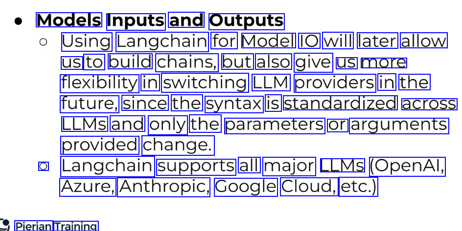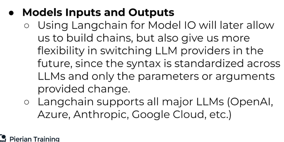 Models Inputs and Outputs Using Langchain for Model IO will later allow us to build chains, but also give us more flexibility in switching LLM providers in the future, since the syntax is standardized across LLMS and only the parameters or arguments provided change. O Langchain supports all major LLMS (OpenAl, Azure, Anthropic, Google Cloud, etc.) Pierian Training