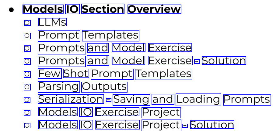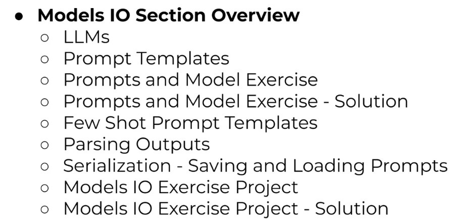 Models IO Section Overview O LLMS O Prompt Templates O Prompts and Model Exercise O Prompts and Model Exercise - Solution O Few Shot Prompt Templates O Parsing Outputs O Serialization - Saving and Loading Prompts O Models IO Exercise Project O Models IO Exercise Project - Solution