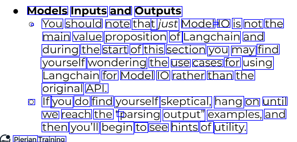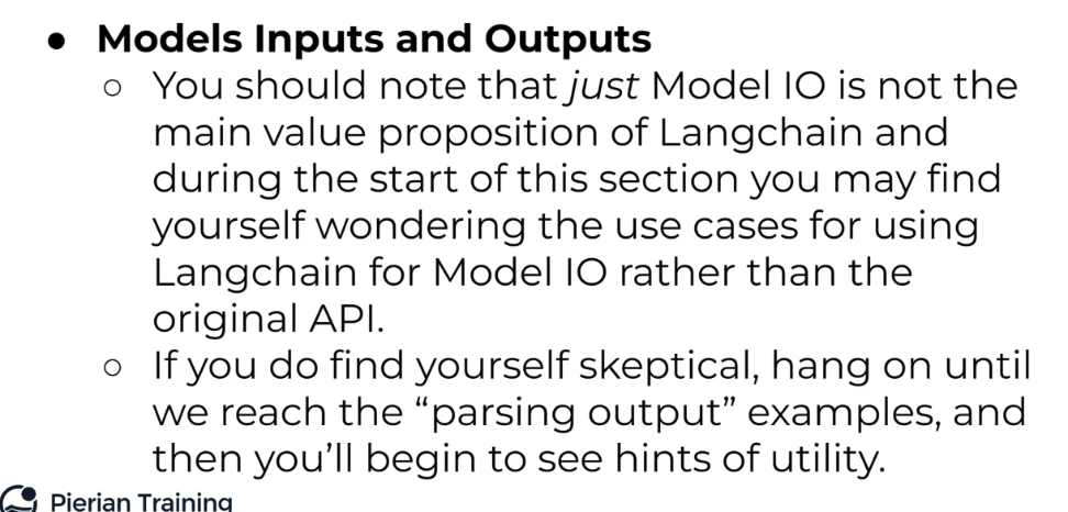Models Inputs and Outputs You should note that tjust Model - IO is not the main value proposition of Langchain and during the start of this section you may find yourself wondering the use cases for using Langchain for Model IO rather than the original API. O If you do find yourself skeptical, hang on until we reach the r parsing output" examples, and then you'll begin to see hints of utility. Pierian Training
