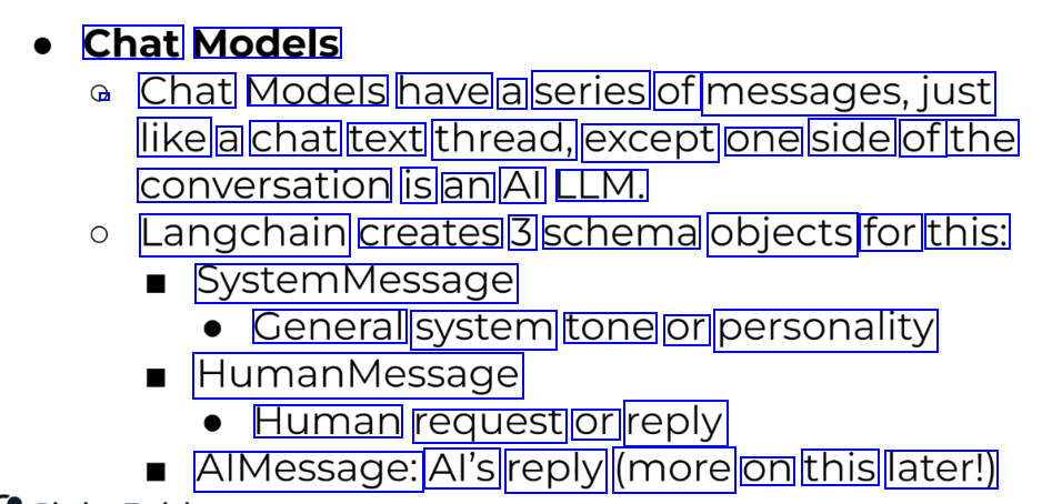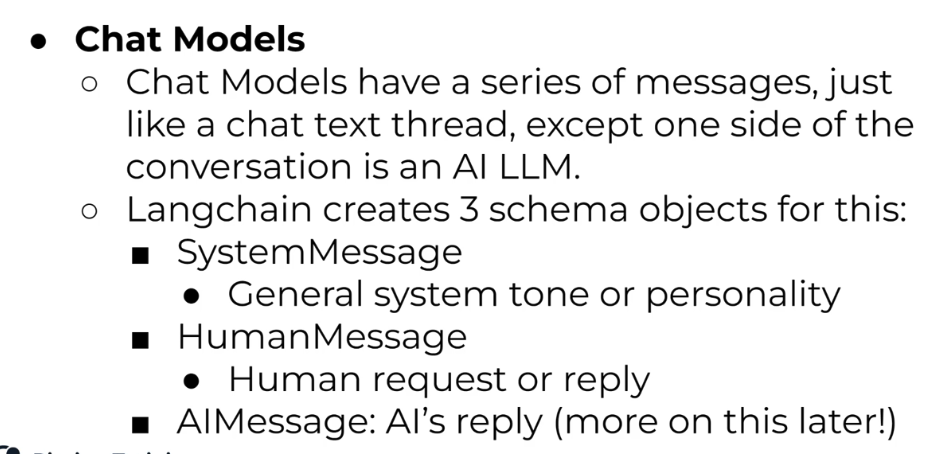 Chat Models / Chat Models have a series of messages,just like a chat text thread, except one side of the conversation is an Al LLM. Langchain creates 3 schema objects for this: SystemMessage General system tone or personality HumanMessage Human request or reply AlMessage: Al's reply (more on this later!)