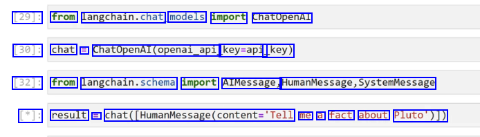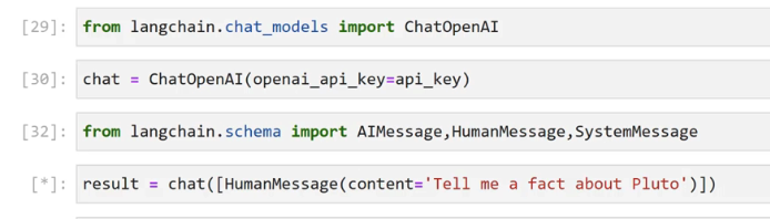 [29]: from Langchain.chat, models import ChatOpenAl [30]: chat = Chatopenal(openal.opl, key=api _key) [32]: from langchain.schema import AIMessage, HumanMessage,SystemMessage [*]: result = chat(_HumanMessage(content-Tell me a fact about Pluto')])