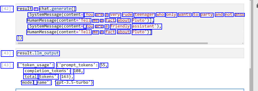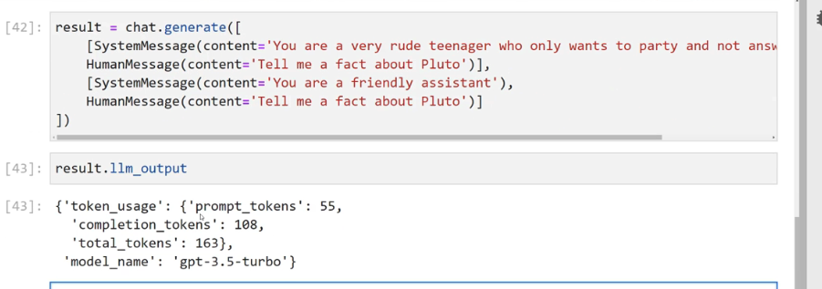[42]: result = chat.generate( SystemMessage(content= 'You are a very rude teenager who only wants to party and not answ HumanMessage(content='Tell me a fact about Pluto')), SystemMessage(content= You are a friendly assistant'), Maanvesagr(ontent-Tell me a fact about Pluto')] 1) [43]: result.llm_output [43]: ('token_usage': ('prompt_tokens': 55, completion_tokens": 108, total_ tokens': 163), model_ _name': gpt-3.5-turbo')