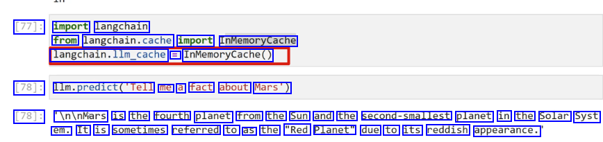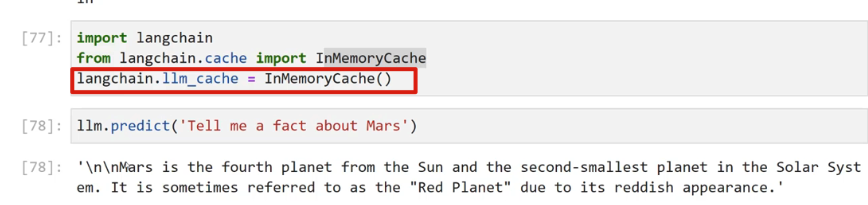 [77]: import langchain from langchain.cache import InMemoryCache langchain.llm.cache = InMemoryCache() [78]: Ilm.predict(Tell me a fact about Mars') [78]: In/nMars is the fourth planet from the Sun and the second-smallest planet in the Solar Syst em. It is sometimes referred to as the "Red Planet" due to its reddish appearance.