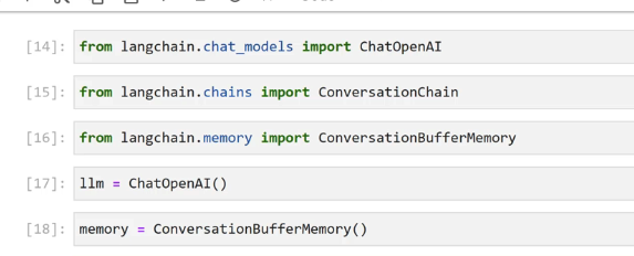 [14]: from langchain. .chat models import ChatopenAI [15]: from langchain.chains import ConversationChain [16]: from langchain.memory import ConversationBufferMemory [17]: 1lm = ChatOpenAI() [18]: memory = ConversationBufferMemory()