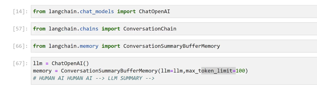 [14]: from langchain.chat - models import ChatOpenAI [57]: from langchain.chains import conversationchaln [66]: from langchain.memory import ConversationsummarBufferwemory [67]: 1lm = ChatOpenAI() memory = ConversationsummaryBufferMemory(llm-llm, max_ token limit-100) # HUMAN AI HUMAN AI --> LLM SUMMARY -